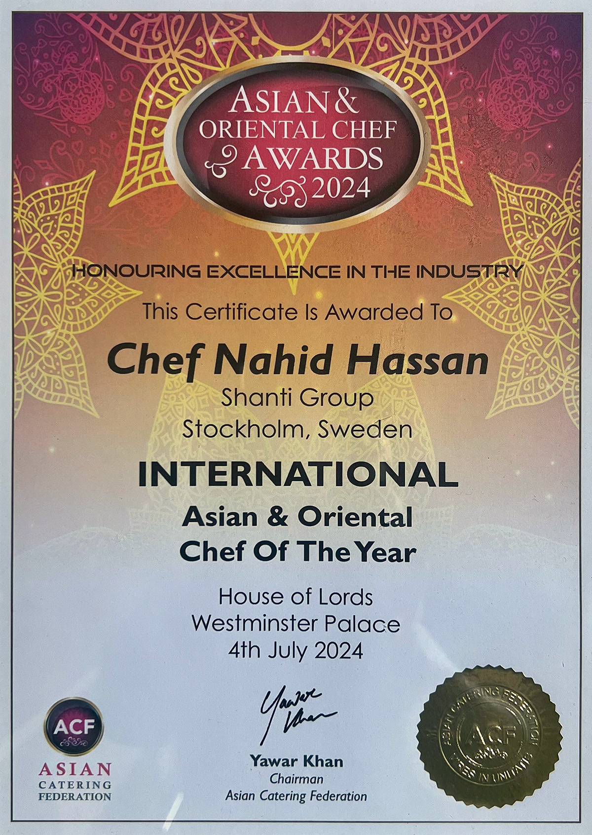 Nahid Hassan from Shanti group is awarded the International Oriental Chef of the Year 2024